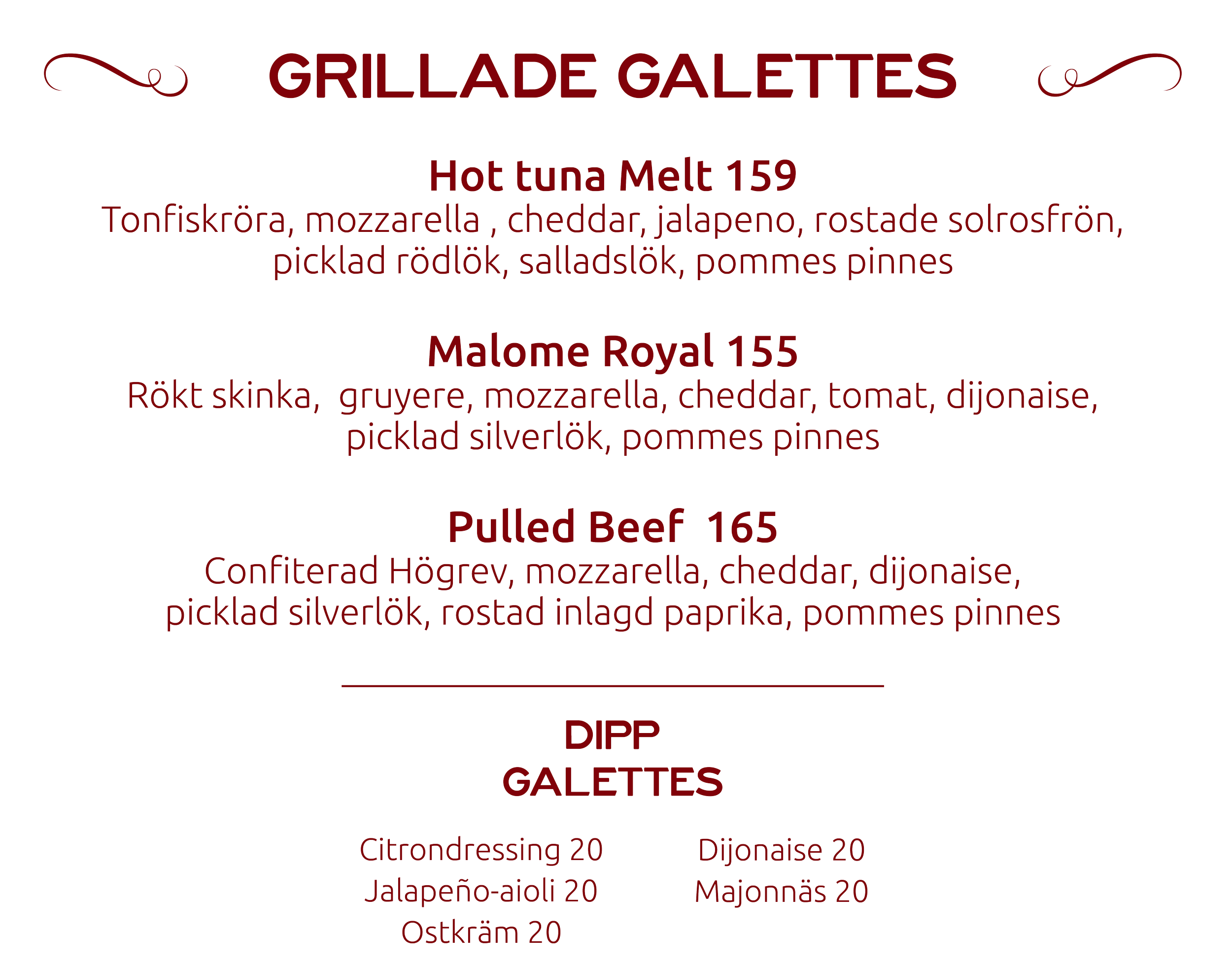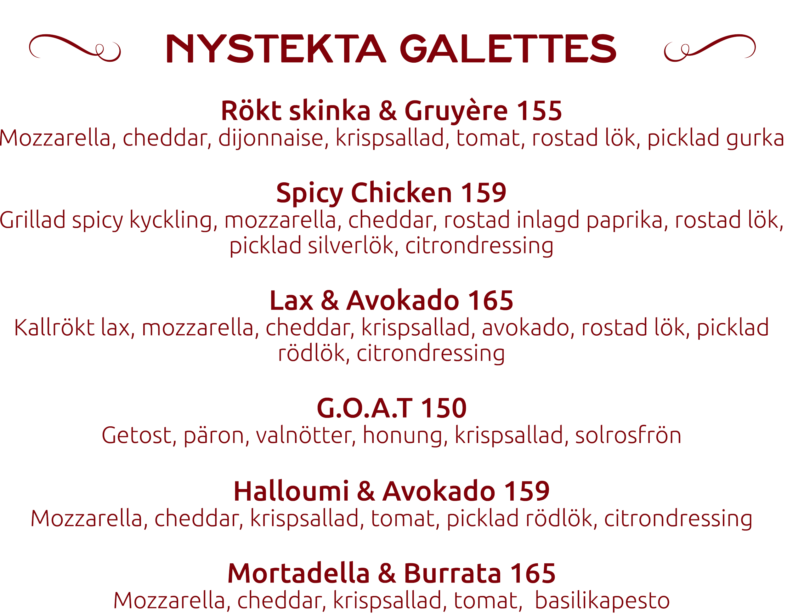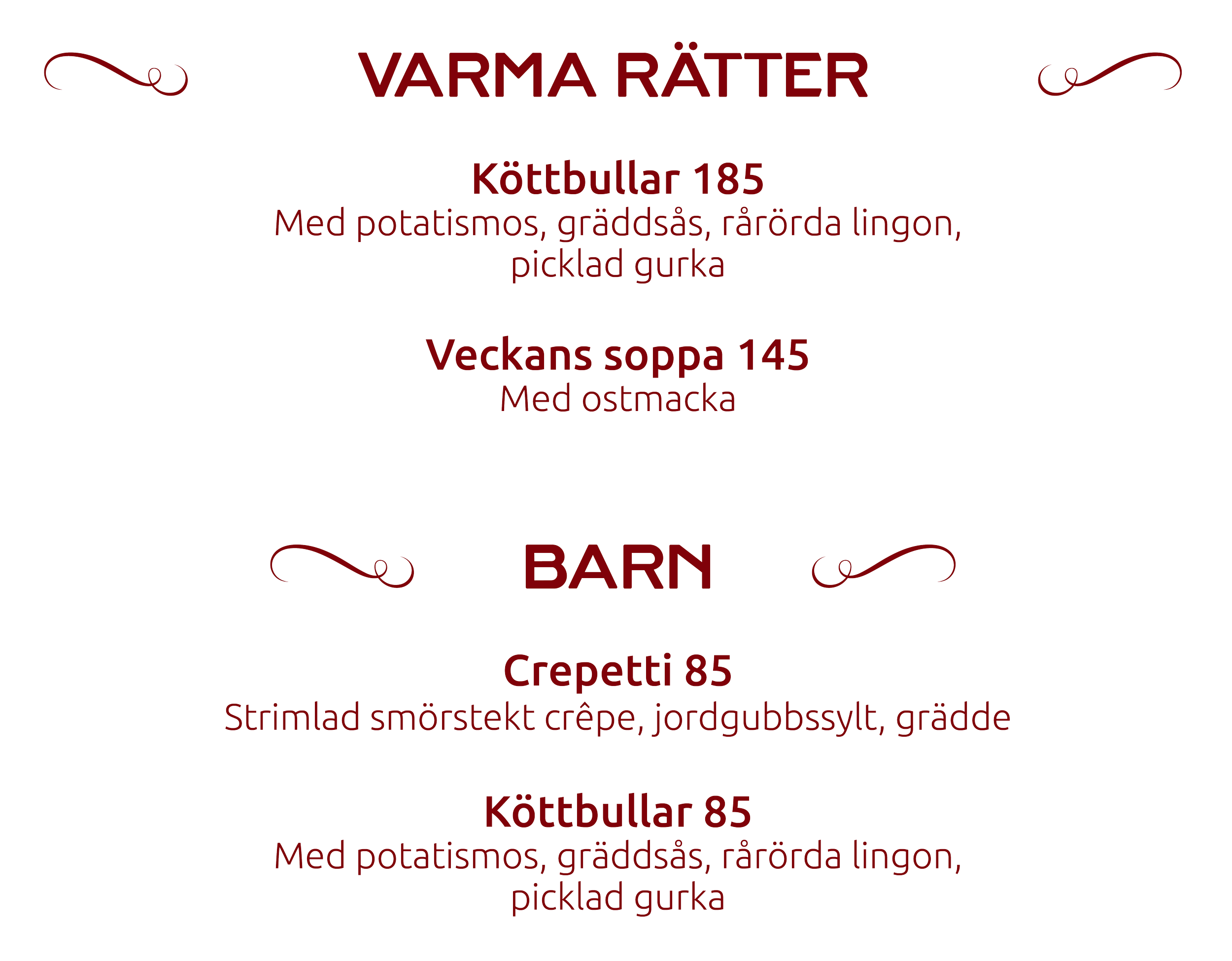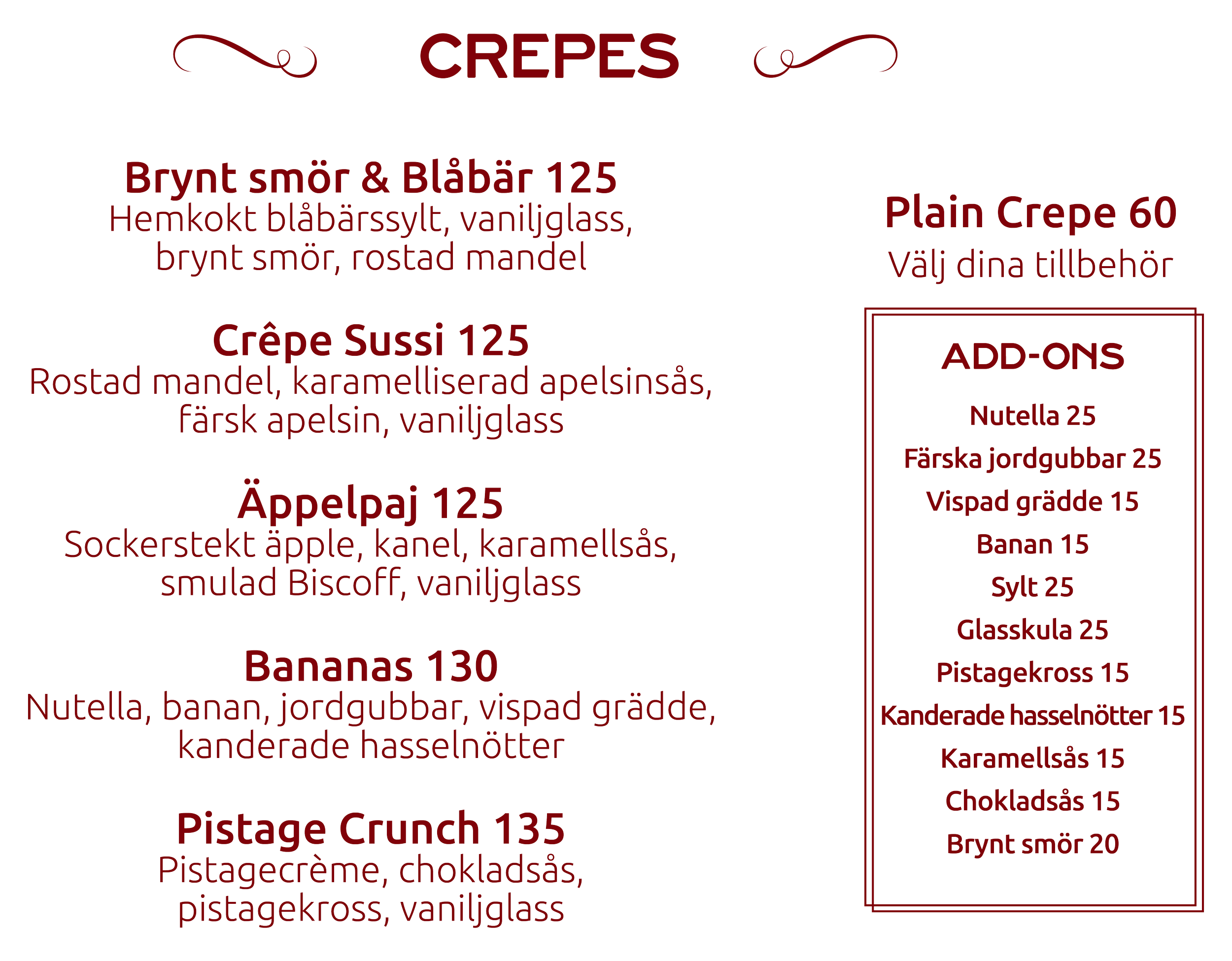 Här hittar du vår meny med matiga lunchrätter, klassiska favoriter, crêpes och caféutbud. Oavsett om du är sugen på en riktig lunch, något lättare eller en fikastund med kaffe och bakverk finns något för alla smaker.